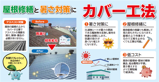 - 梅雨も明け、いよいよ夏本番となりました。<br end="178" start="175">この時期になると、工場や倉庫など<strong end="210" start="194">屋内の暑さに関するご相談</strong>が一気に増えてまいります。熱中症対策や空調負荷の軽減が求められる中、**屋根からの熱を抑える「遮熱対策」**が注目されています。今月は、**既存の屋根に重ねて施工できる「遮熱シートのカバー工法」**をご紹介いたします。 <div><br></div><div><strong>遮熱シートのカバー工法とは</strong></div><div><strong><br></strong></div><div>既存の屋根の上に遮熱シートを敷き、さらにその上から新しい屋根材をかぶせる工法です。<strong end="417" start="397">屋根修繕と遮熱対策を同時に行える</strong>のが大きな特徴で、しかも屋根の上で作業が完結するため、<strong end="468" start="447">工場や倉庫を稼働させたまま施工可能</strong>です。 <br></div><div><br></div><div><strong>アスベストを含む屋根にも対応</strong></div><div><br></div><div>とくに最近増えているのが、<strong>アスベストを含む古いスレート屋根</strong>に関するご相談です。</div><div><br></div><div>「屋根を修理したいが、アスベストの撤去には手間とコストがかかる」</div><div>「解体工事が必要なら営業を止めなければならないかも…」</div><div><br></div><div>このようなお悩みに対しても、<strong>カバー工法は有効な解決策</strong>となります。</div><div>アスベストを撤去せず、<strong>封じ込める形で遮熱シートを施工</strong>できるため、</div><div><strong>営業を続けながら暑さ対策・劣化対策が可能になります。</strong></div><div><strong><br></strong></div><div>アスベスト対策についてはこちらから</div><div><div><a href="https://clt1756280.benchurl.com/c/l?u=12BBE3AB&e=1A196EC&c=1ACC78&t=1&l=4F9D0046&email=RugSezPVOrmWXfl99VvSp%2FPweS7dcu8m&seq=1" target="_blank">https://www.mlit.go.jp/jutakukentiku/build/Q%26A/index.html#research_asbestos</a></div><div><br></div><div><strong>お気軽にご相談ください!</strong></div> <br></div><div><div>7月〜9月は、毎年工場・倉庫の遮熱対策がもっとも注目される時期です。<br end="757" start="754">施工のご相談・見積もりのご依頼はお気軽にお問い合わせください。</div><div> </div><div>施工場所の写真、図面を送っていただけましたら概算見積りも可能です。</div> <br></div><div><strong><br></strong></div><div><strong><br></strong></div><div><strong><br></strong></div><div style="text-align:left"><div style="text-align:left"><table width="600" cellpadding="0" cellspacing="0"><tbody><tr><td><table cellpadding="0" cellspacing="0" width="100%"><tbody><tr><th style="text-align:left"><br></th></tr></tbody></table></td></tr></tbody></table></div></div>